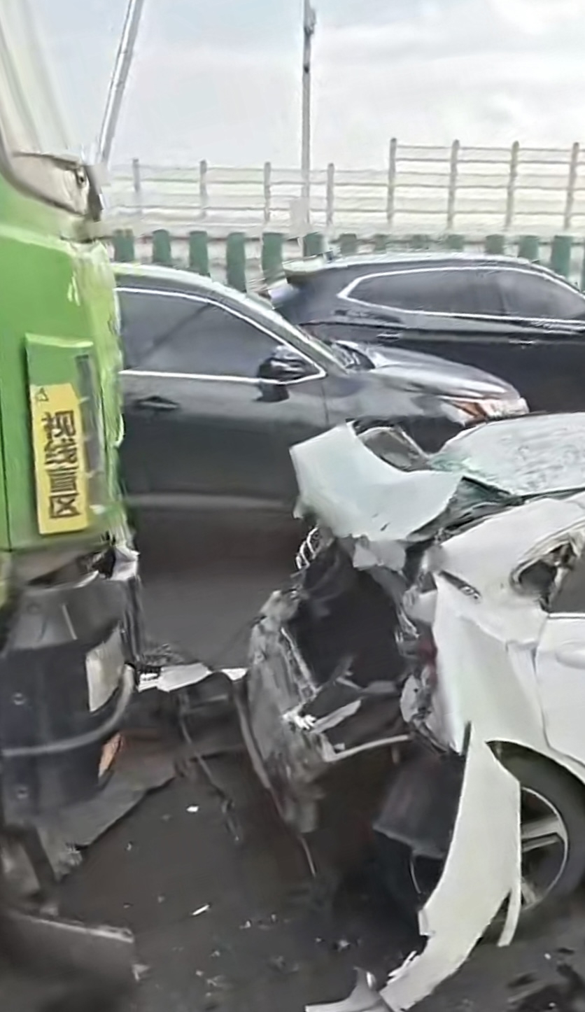 昨天(15日)下午2时许,有市民报料,称徐浦大桥浦东往浦西方向发生三车追尾事故,其中一辆轿车被夹在土方车和厢式货车之间,车辆受损较重,所幸事故未造成人员伤亡。