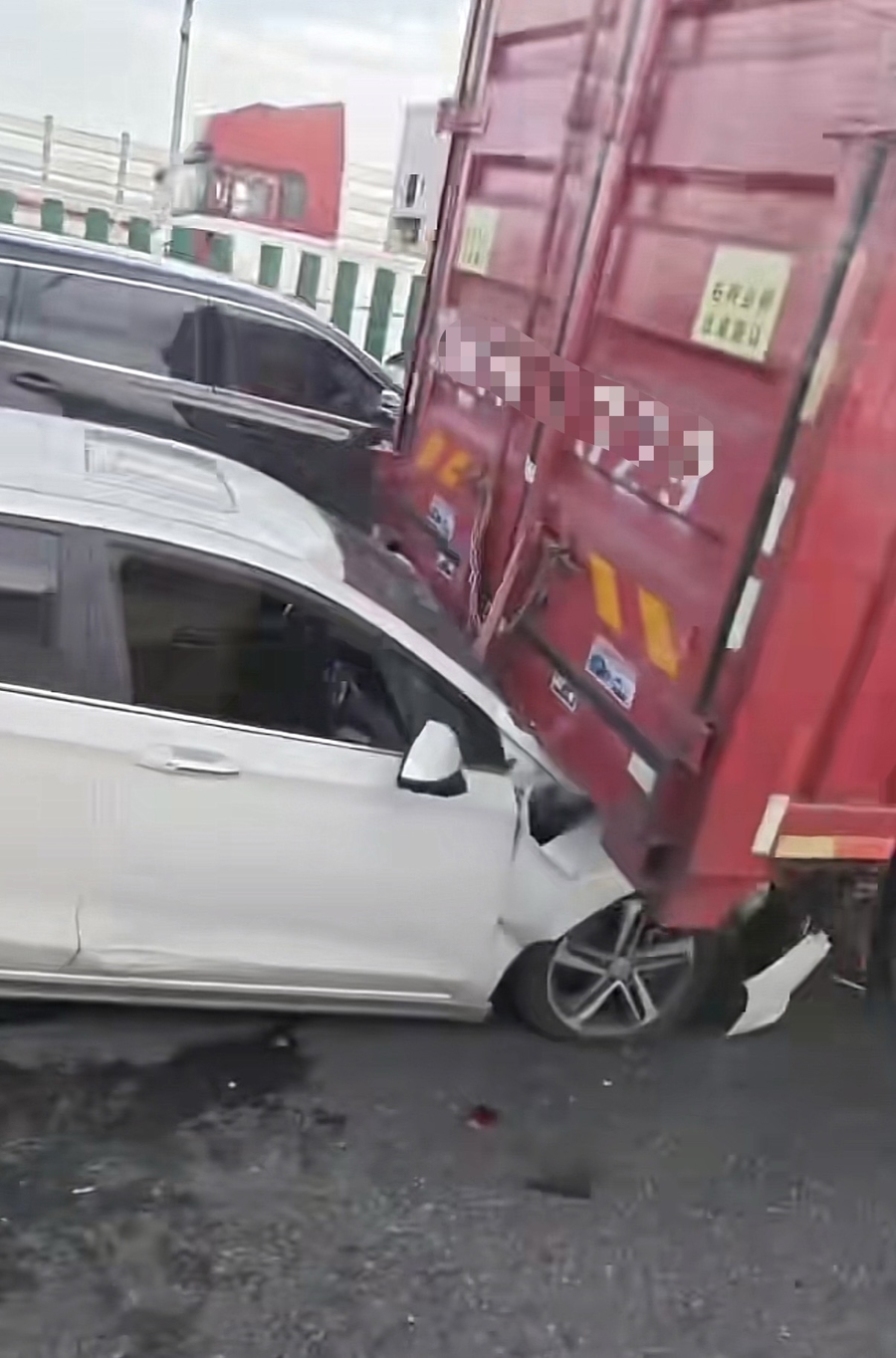 经过现场的驾驶员看到,现场有一辆白色轿车被一辆土方车追尾后,又撞上前方的一辆红色厢式货车。由于撞击力度较大,轿车车尾凹陷,车头引擎盖位置钻进货车车尾。